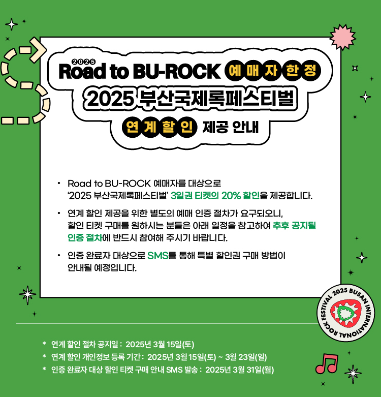 - 세부 내용 및 변동 사항은 예매처 상세페이지 및 부산국제록페스티벌 공식 SNS(인스타그램 @busanrockfest)를 통해 업데이트될 예정이오니, 지속적으로 내용을 확인해 주시기 바랍니다.